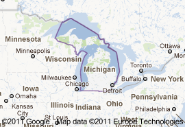 We drive from almost the furthest southeastern point on the map (near Detroit) to the furthest location northwesterly (is that a word?) in the fingerlike projection east of Minnesota. So, the northwesterly fingerlike thingy. You see what I mean, right?