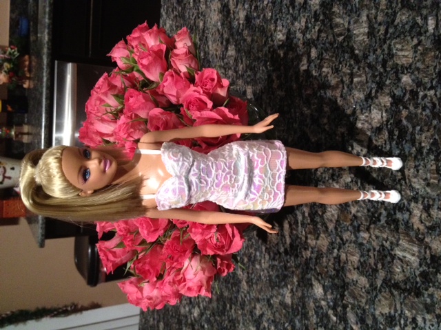 As you can see, although the picture doesn’t even do it justice, her outfit is something one might wear on their way to work as a “hostess” in a “club,” perhaps a club designated for “gentlemen” somewhere near “the airport.” In real life, the dress is even shorter than the picture makes it appear. It is more like something that someone (not me) might wear as a SHIRT. And it’s made out of shiny plastic, which makes sense because you could just wipe the cake off of it and all, but STILL.